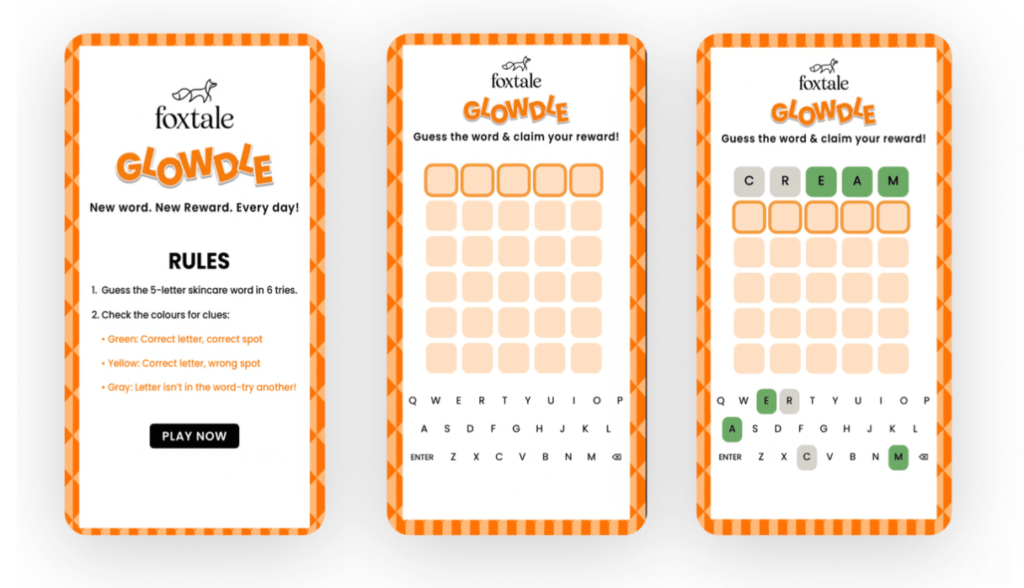 In 2024, Wordle-style games logged over 4 billion global plays, proving that simple puzzles can create powerful daily habits. Foxtale integrated the Wordle game through Playzo to connect with this trend. Each day, users were encouraged to solve a skincare-themed puzzle—unlocking coupon codes or product insights with every win. This gamified challenge turned passive scrolling into a morning ritual, fostering consistent re-engagement and emotional connection with the brand over time.