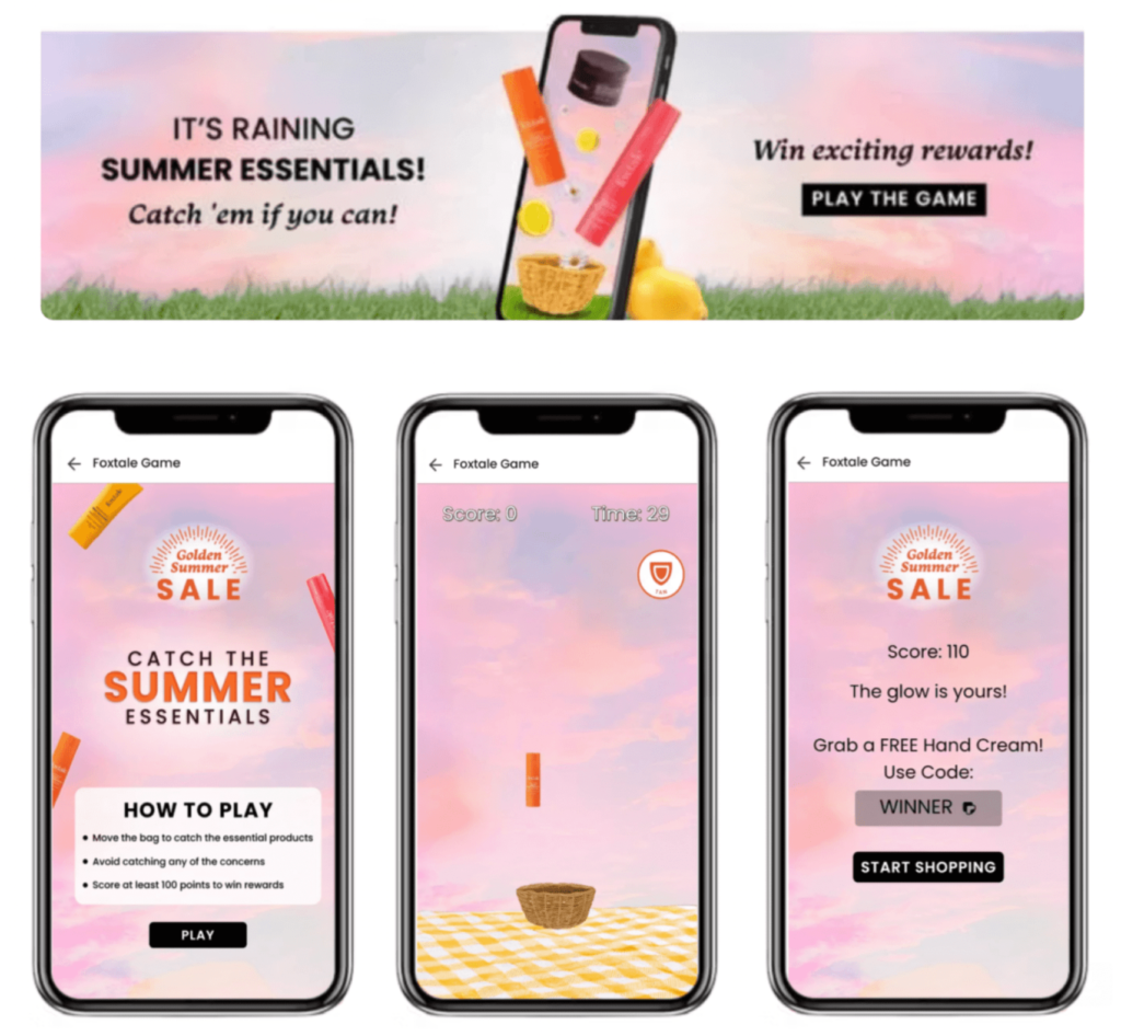 Next, Foxtale launched an addictive Catch Game through Playzo’s arcade collection. Players had to “catch” healthy skincare ingredients while avoiding common skin issues—combining entertainment with education. This dynamic gameplay helped Foxtale educate users about its product ingredients, benefits, and proper routines in an engaging manner. It was interactive storytelling in action, perfectly tailored for Gen Z and millennial audiences who prefer playful, immersive experiences over static content.